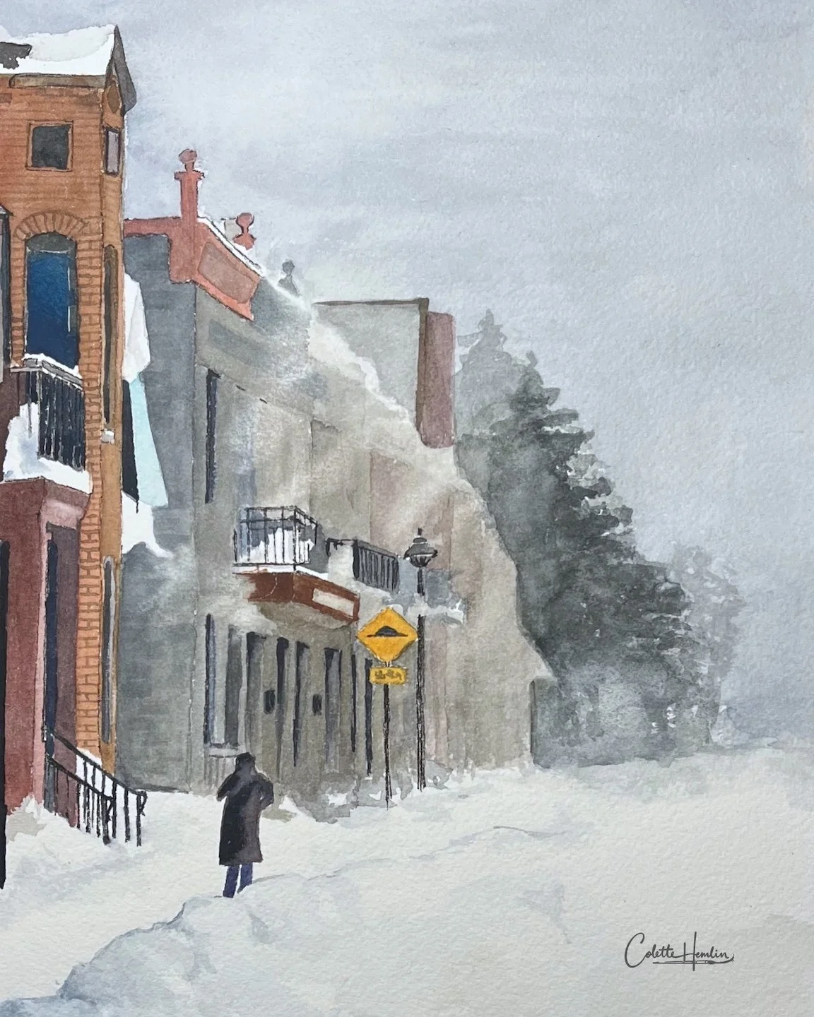Quebec winters inspire me, whether in the city or the countryside, after a heavy snowfall or under a bright blue but freezing sky. And I'm probably not the only one, because I regularly have to replenish my supply of watercolors. But I'm not complaining, far from it. In fact, I'm already looking forward to next winter.
